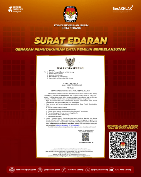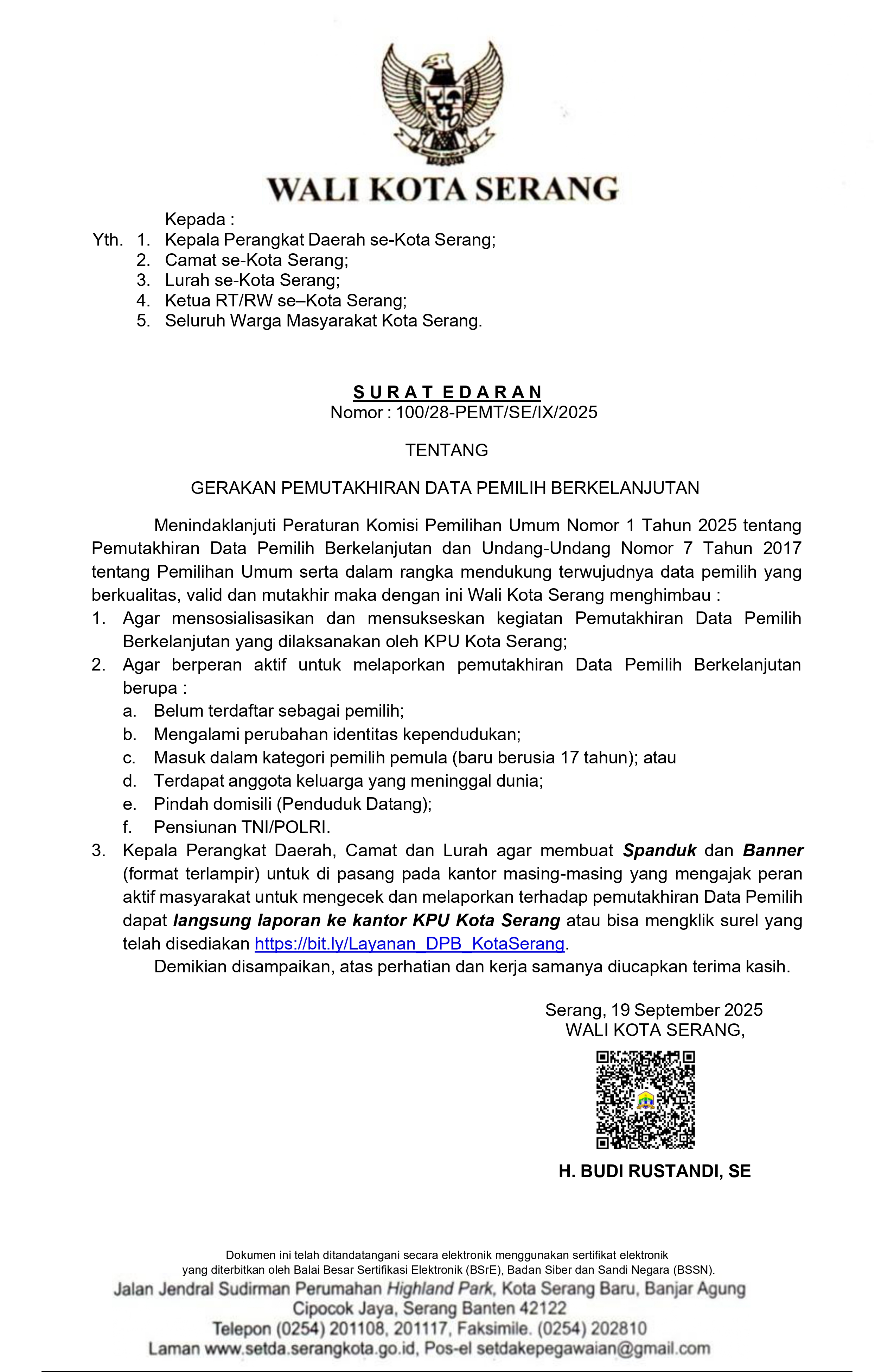 Serang, 19 September 2025 – Wali Kota Serang, H. Budi Rustandi, SE, secara resmi menerbitkan Surat Edaran Nomor 100/28-PEMT/SE/IX/2025 tentang Gerakan Pemutakhiran Data Pemilih Berkelanjutan. Edaran ini dikeluarkan sebagai tindak lanjut atas Peraturan Komisi Pemilihan Umum (PKPU) Nomor 1 Tahun 2025 tentang Pemutakhiran Data Pemilih Berkelanjutan dan Undang-Undang Nomor 7 Tahun 2017 tentang Pemilihan Umum.