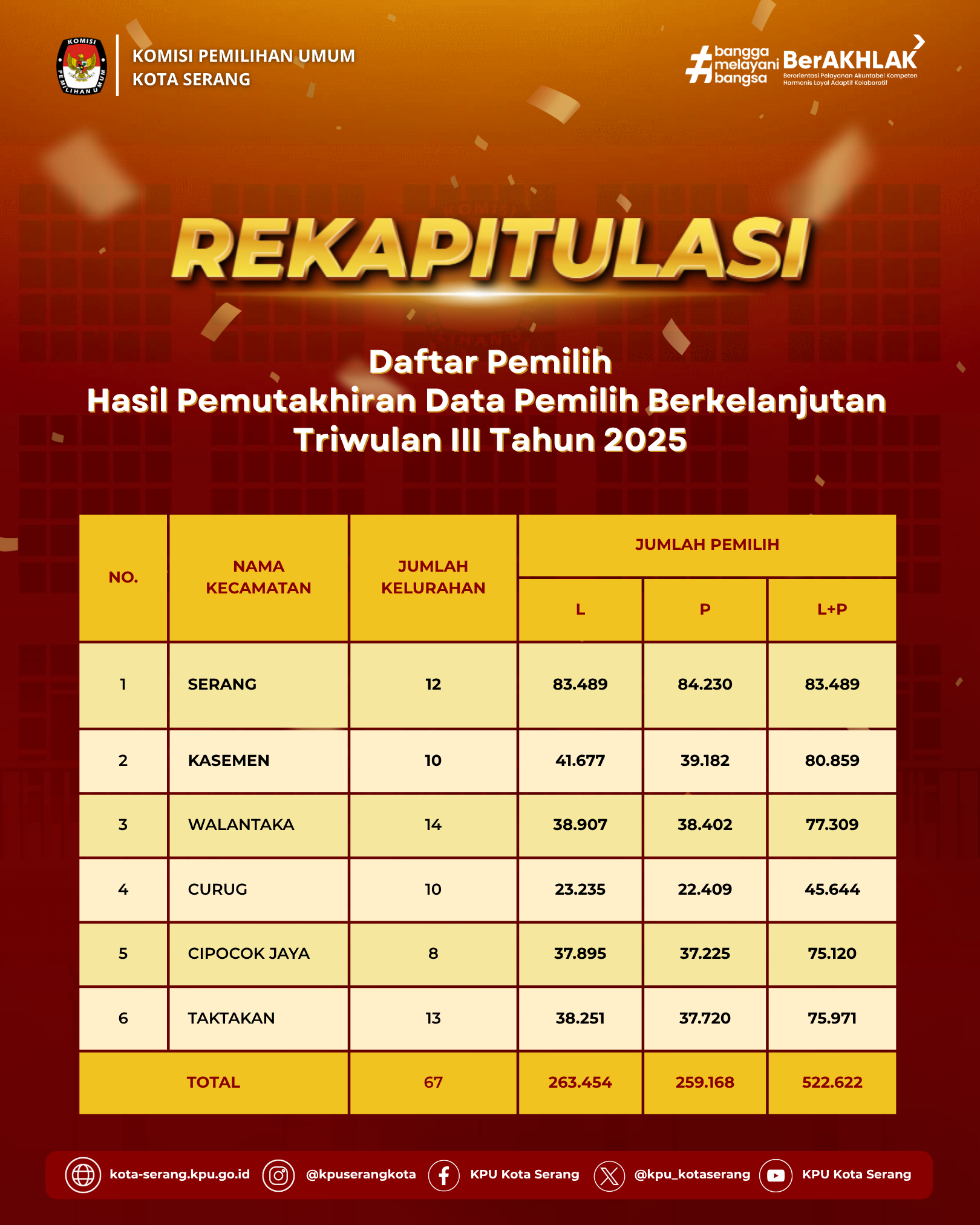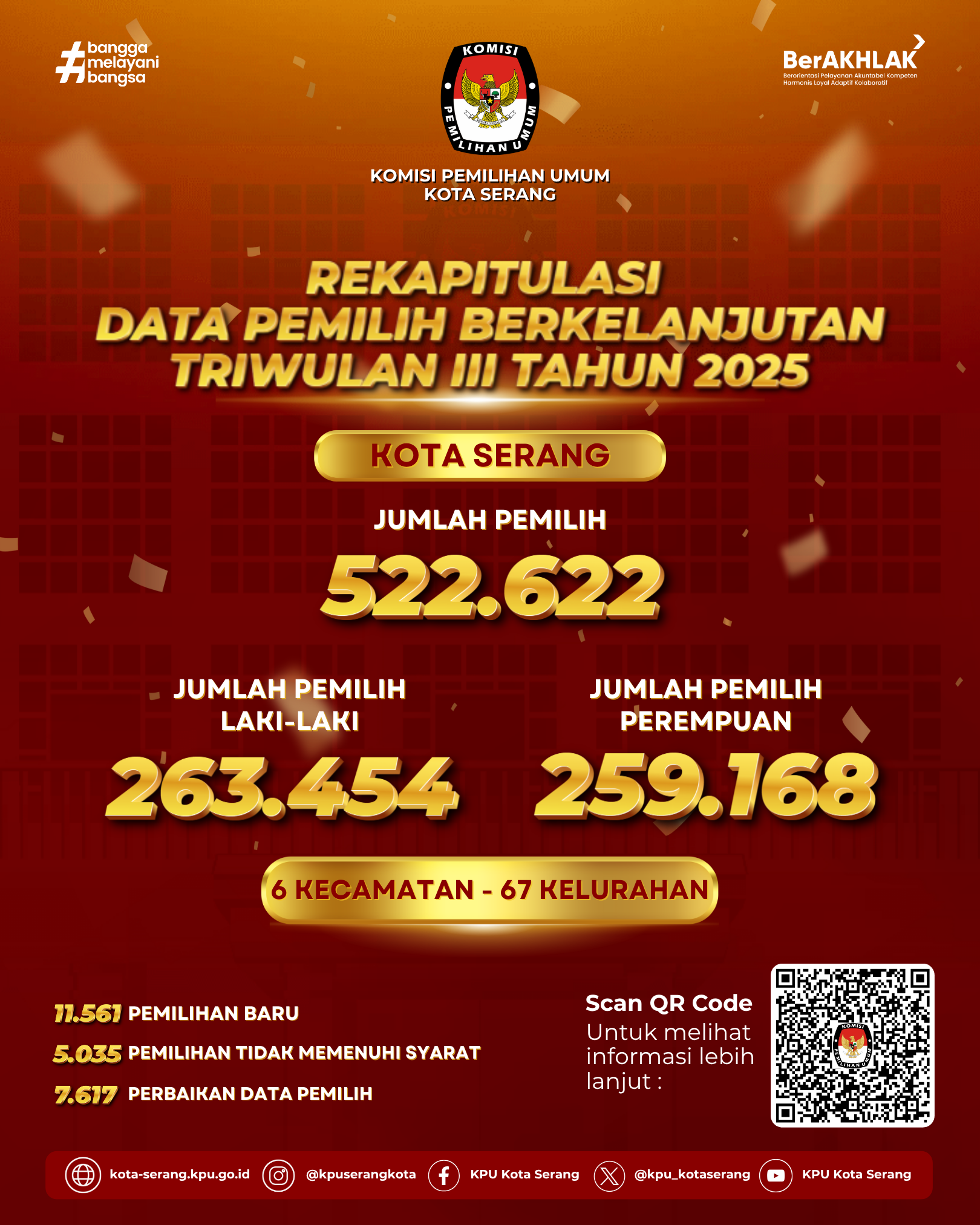 Rekapitulasi Pemutakhiran Data Pemilih Berkelanjutan Periode Triwulan III Tahun 2025 Tingkat Kota Serang yaitu berjumlah 522.622 Pemilih dengan rincian Pemilih Laki-laki sejumlah 263.454 Pemilih dan Pemilih Perempuan sejumlah 259.168 Pemilih. Pergerakan data tersebut dialami dari jumlah Potensi Pemilih Baru sejumlah 11.561 Pemilih, Pemilih Tidak Memenuhi Syarat (TMS) sejumlah 5.035 Pemilih, serta Perbaikan Data Pemilih sejumlah 7.617 Pemilih. Pergerakan data tersebut bersumber dari hasil pencermatan terhadap daftar pemilih tetap terakhir dengan data hasil konsolidasi KPU RI dengan Kementerian/Lembaga terkait yang berhubungan dengan pengelolaan data pemilih berkelanjutan, masukan dan tanggapan pihak lembaga/instansi terkait, dan pencermatan mandiri (self-assesment) oleh KPU Kota Serang.