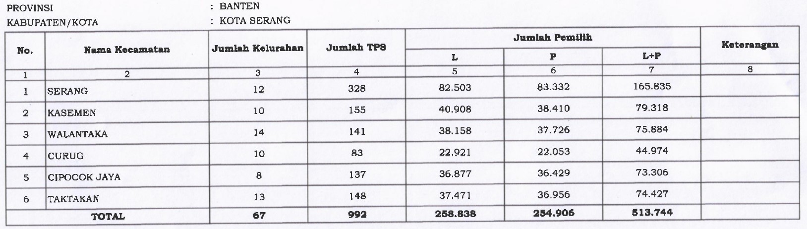Hasil Rekapitulasi Penatapan daftar Pemilih Sementara di Kota Serang Sejumlah 513.744 Pemilih, jumlah pemilih laki-laki 258.838 pemilih perempuan 254.906 jumlah pemilih tersebar di 6 Kecamatan, 67 Kelurahan dan 922 TPS.