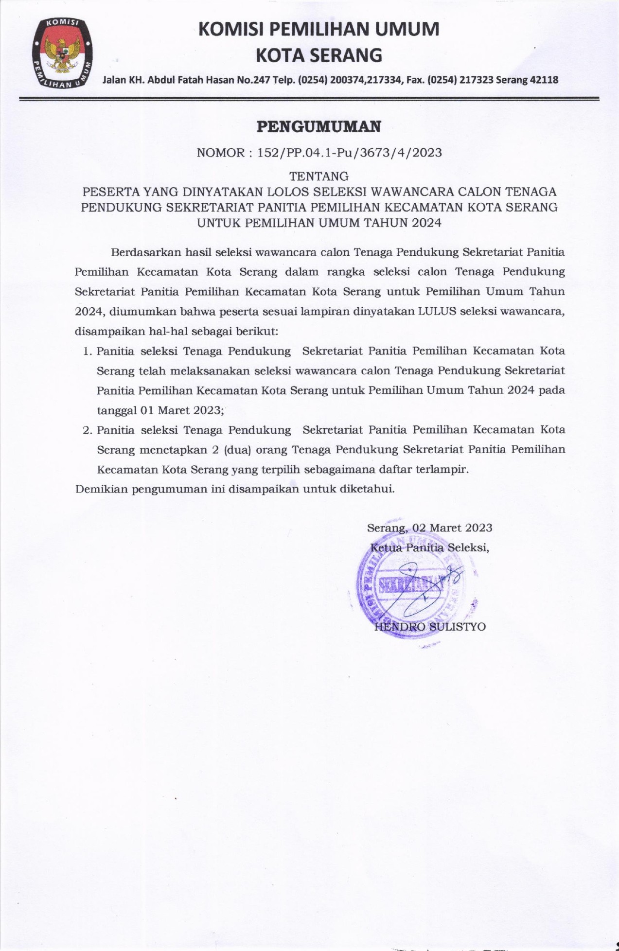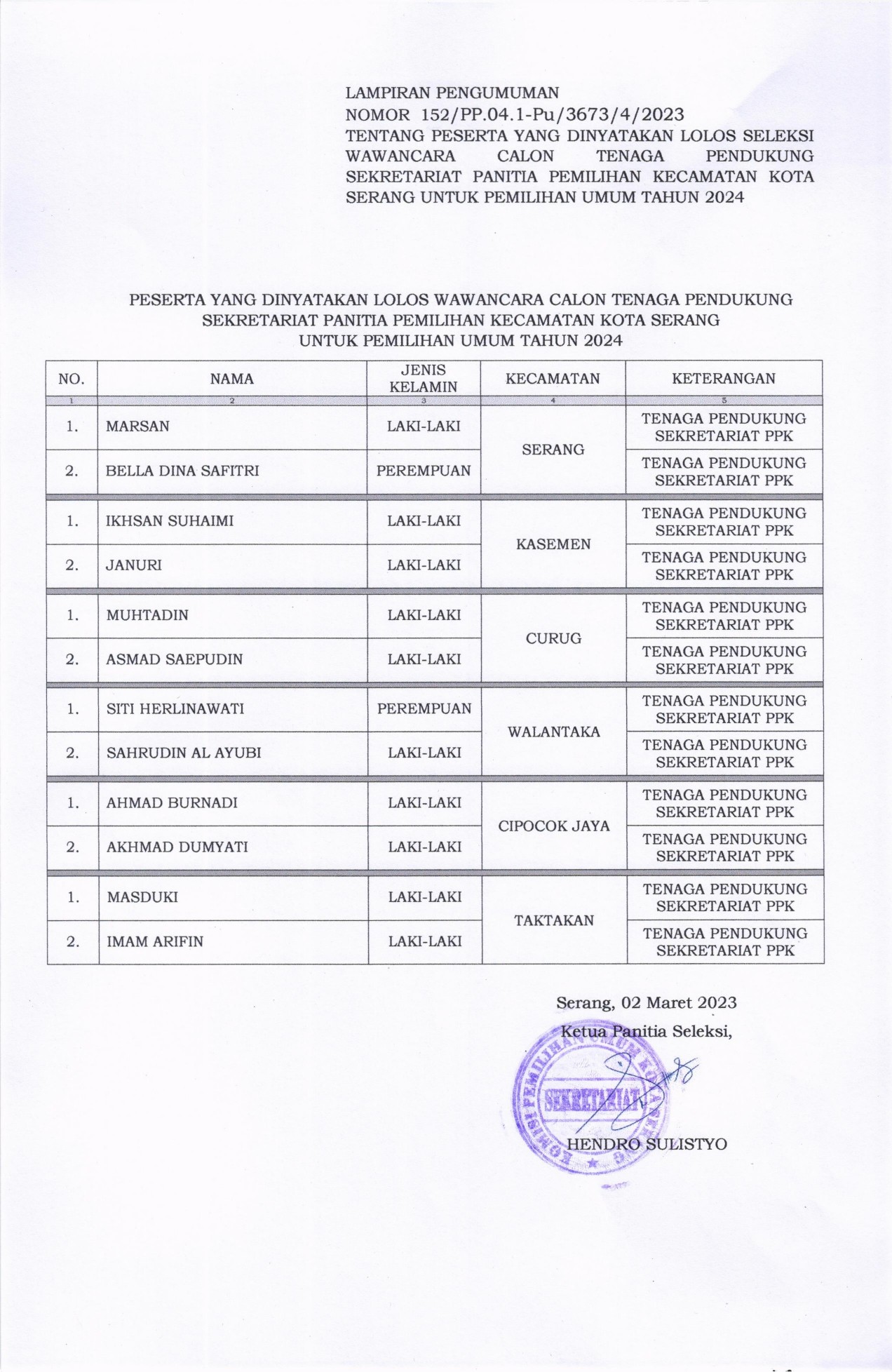 Pengumuman Seleksi Wawancara Calon Tenaga Pendukung Sekretariat Panita Pemilihan Kecamatan (PPK)