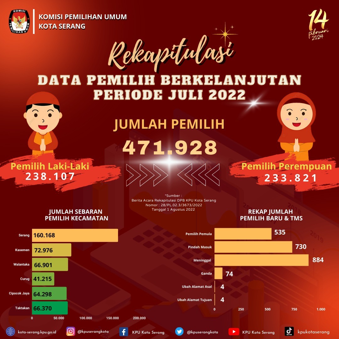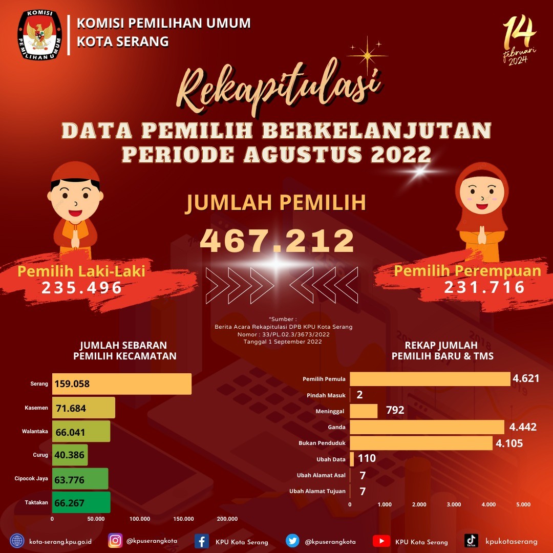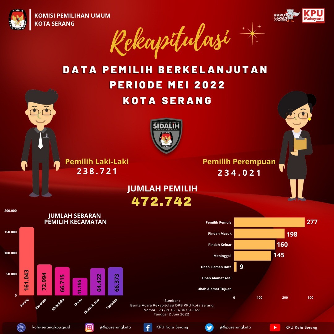 Tercatat jumlah data pemilih bulan Mei tahun 2022 sebanyak 472.572 pemilih. Sedangkan Pada bulan Juni 2022 mengalami peningkatan. Dengan rincian, 277 Pemilih Pemula, 198 Pemilih Pindah Masuk, 160 Pemilih Pindah Keluar 145, 145 Pemilih Meninggal, 09 Pemilih Ubah elemen data, 0 Pemilih Ubah Alamat Asal dan 0 Pemilih Ubah Alamat Tujuan. Pergerakan data pemilih tersebut berasal dari hasil masukan dari Dinas Kependudukan dan Catatan Sipil Kota Serang; Dinas Sosial Kota Serang; Rukun Tetangga (RT) Se Kecamatan Serang; Perkumpulan Penyandang Disabittas (PPDI) Kota Serang; dan Tanggapan Masyarakat.
