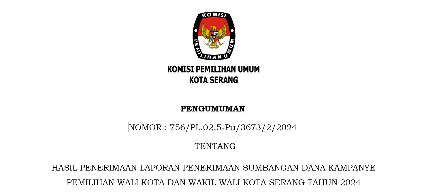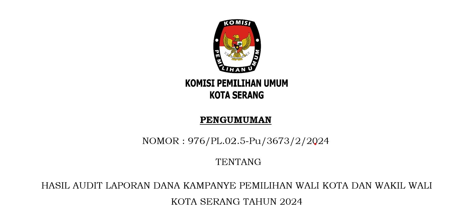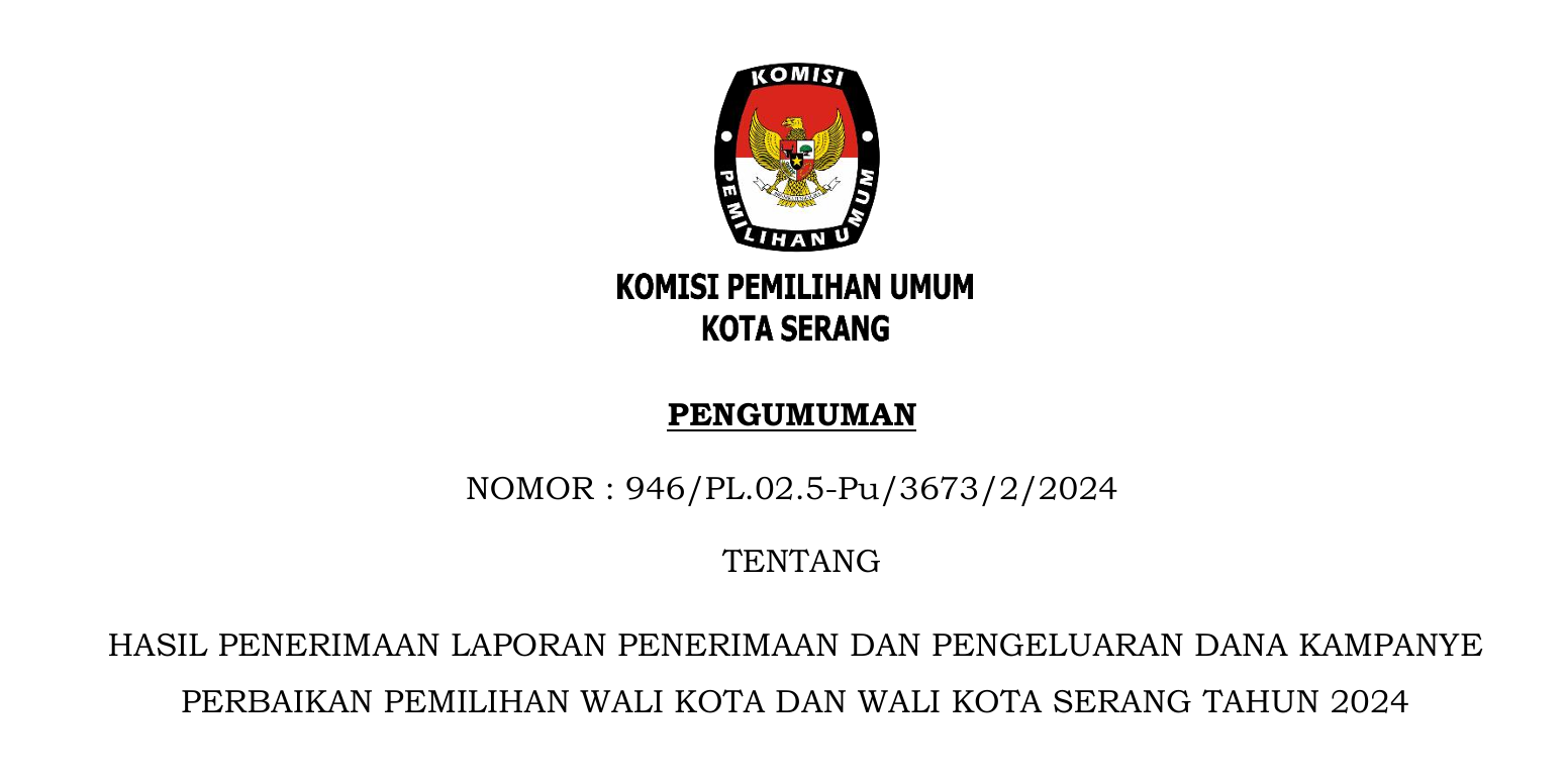 Bahwa untuk melaksanakan ketentuan Pasal 55 ayat (4) Peraturan Komisi Pemilihan Umum Nomor 18 Tahun 2024 tentang Rekapitulasi Hasil Penghitungan Perolehan Suara dan Penetapan Hasil Pemilihan Gubernur dan Wakil Gubernur, Bupati dan Wakil Bupati, serta Walikota dan Wakil Walikota. KPU Kota Serang mengumumkan hasil pemilihan Wali Kota dan Wakil Wali Kota Serang tahun 2024 sesuai dengan Keputusan Komisi Pemilihan Umum Kota Serang Nomor 637 Tahun 2024 Tentang Penetapan Hasil Pemilihan Walikota Dan Wakil Walikota Serang Tahun 2024, Dapat didownload melalui link dibawah ini :