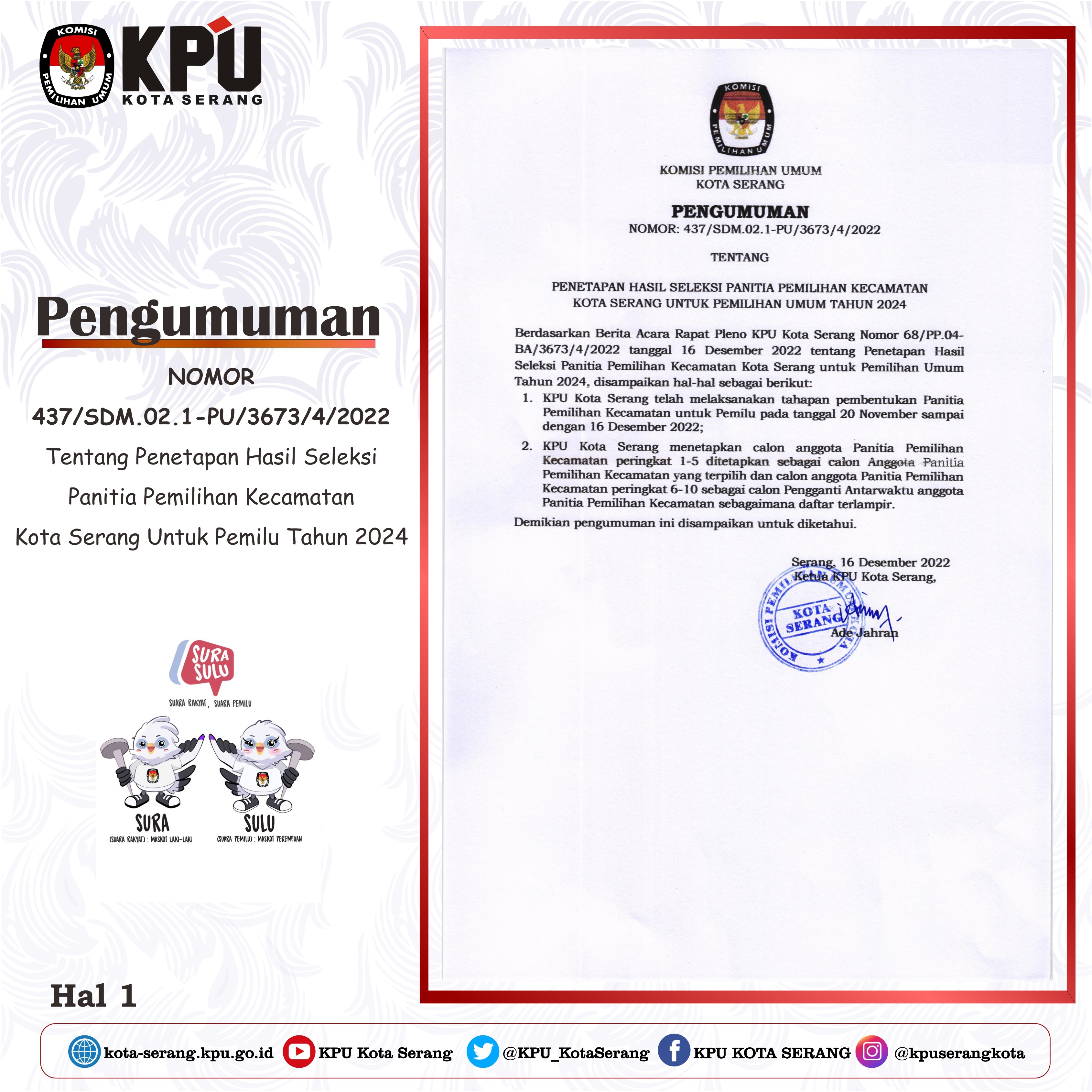 Berdasarkan Berita Acara Rapat Pleno KPU Kota Serang Nomor 024/PP.04.1-BA/3673/2023 tanggall 12 Januari 2023 tentang Hasil Seleksi Tertulis Calon Anggota Panitia Pemungutan Suara untuk Pemilu Tahun 2024, disampaikan hal-hal sebagai berikut: