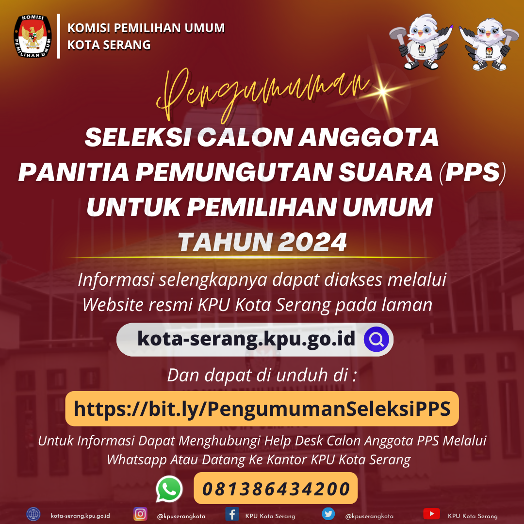5. KPU Kota Serang menerima masukan/tanggapan masyarakat terhadap calon anggota Panitia Pemungutan Suara (PPS) yang telah dinyatakan lulus seleksi tertulis disampaikan secara tertulis dan dilampiri identitas diri melalui email hukumkpuserang@gmail.com atau melalui pos ke kantor KPU kota Serang Jalan Kh. Abdul Fatah Hasan No 247, Kel. Sumur Pecung, Kec. Serang mulai sejak tanggal 11 s.d. 14 Januari 2023.